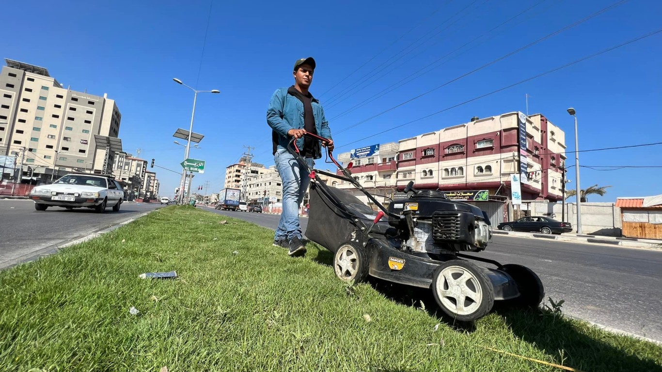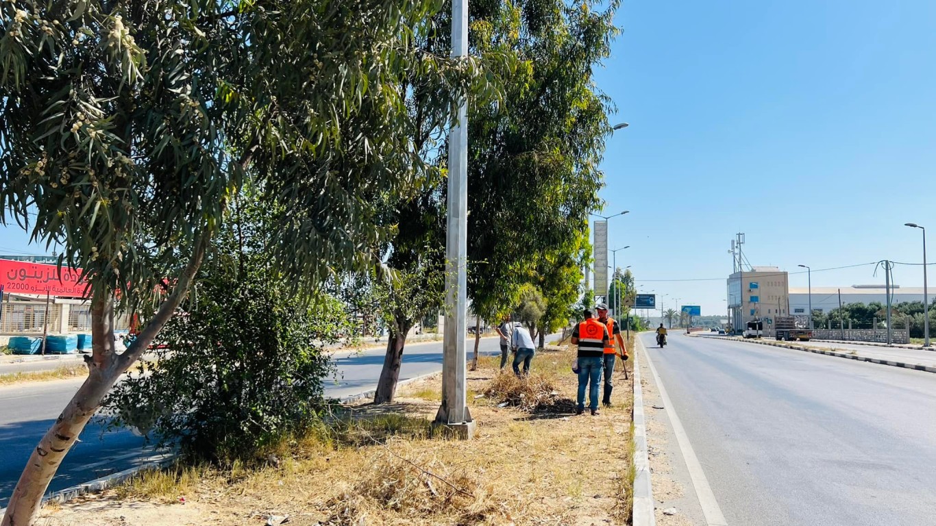 قسم الصحة والبيئة في بلدية البريج يواصل أعماله في عميلة تهذيب وتعشيب الجزيرة الوسطى في شارع صلاح الدين.