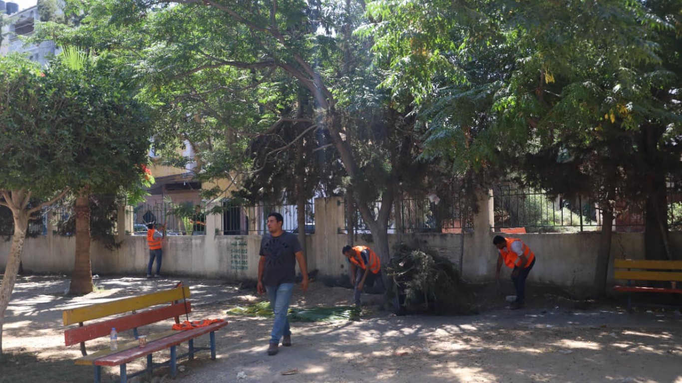 قسم الصحة والبيئة في بلدية البريج خلال أعماله في عميلة تهذيب وتقليم الأشجار في متنزه البريج العمومي.