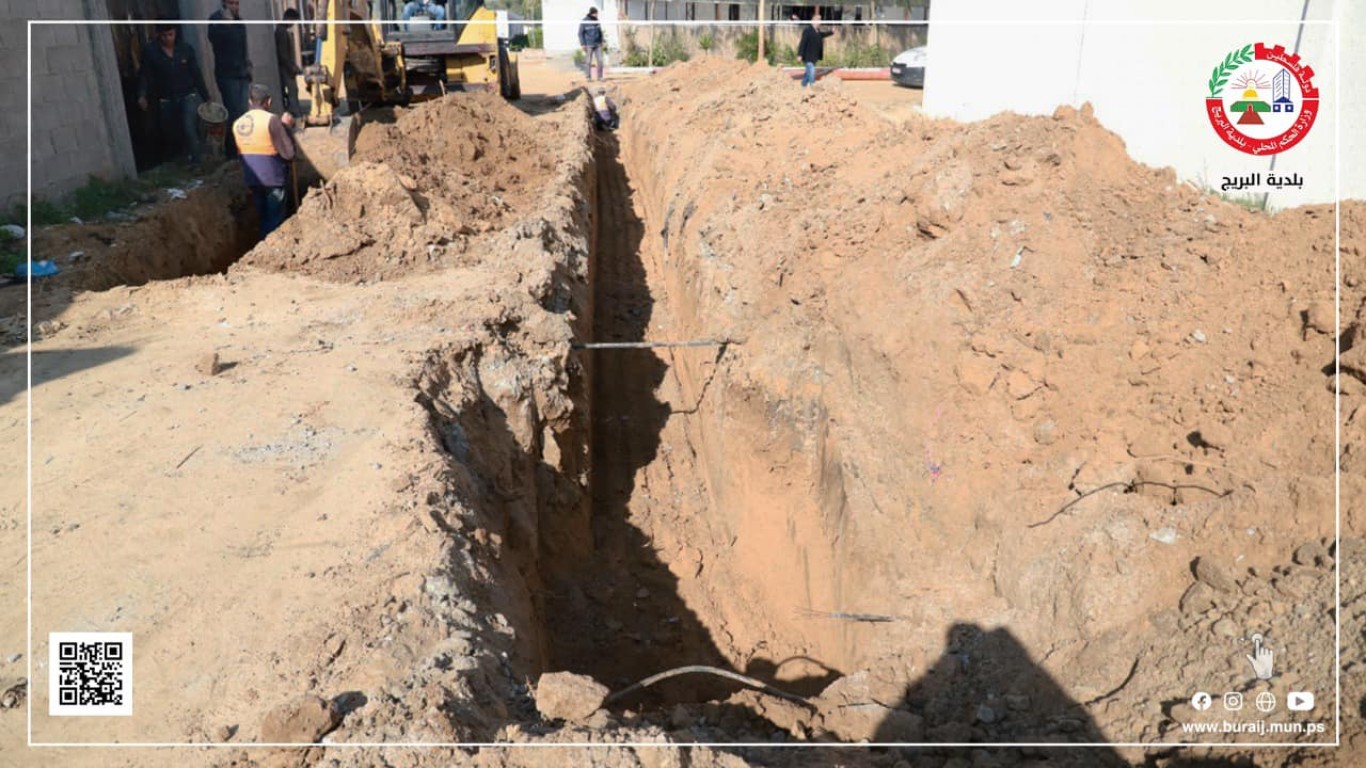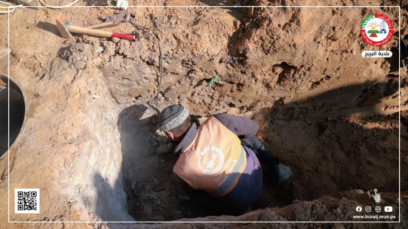 قسم المياه في بلدية البريج خلال أعمال توصيل خط صرف صحي بطول 25متر ، وتوصيل خط مياه بقطر 2 أنش في منطقة بلوك 9، يساعد ذلك في خدمة المنطقة والسكان.