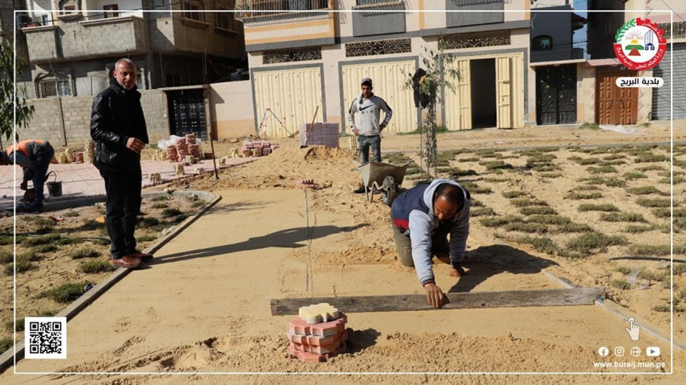 قسم المواصفات والمشاريع في بلدية البريج خلال أعمال تبليط جزء من جزيرة شارع السكة ببلاط (البستنة) المزخرف، ضمن خطة البلدية لتطوير شارع السكة والجزيرة الخاصة به، وإعطاءها الطابع المتنزه والجمالي