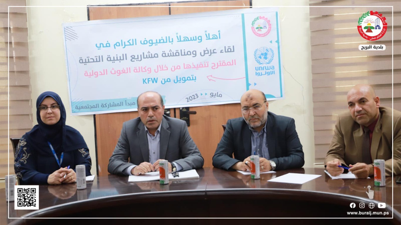 ناقشت بلدية البريج ووكالة الغوث وتشغيل اللاجئين "الأونروا" مع سكان مخيم البريج لقاء حول مشاريع البنية التحتية المقترح تنفيذها من خلال وكالة الغوث الدولية بدعم من KFW، لحل المشاكل التي يعاني منها المخيم، جاء ذلك خلال لقاء تشاوري بحضور رئيس بلدية البريج م. أيمن الدويك، ووفداً من وكالة الغوث الدولية ضم كلاً من أ. سامي الصالحي مدير عمليات الوكالة في المحافظة الوسطى، و م. عصام عامر مدير المشروع، و م. سها شامية منسقة المشروع، و م. داليا مطر مسؤولة النواحي البيئية والاجتماعية للمشاريع الممولة من المنحة الألمانية، ولجان الأحياء ولجنة المسائلة المجتمعية، والمخاتير والإعلاميين والوجهاء.