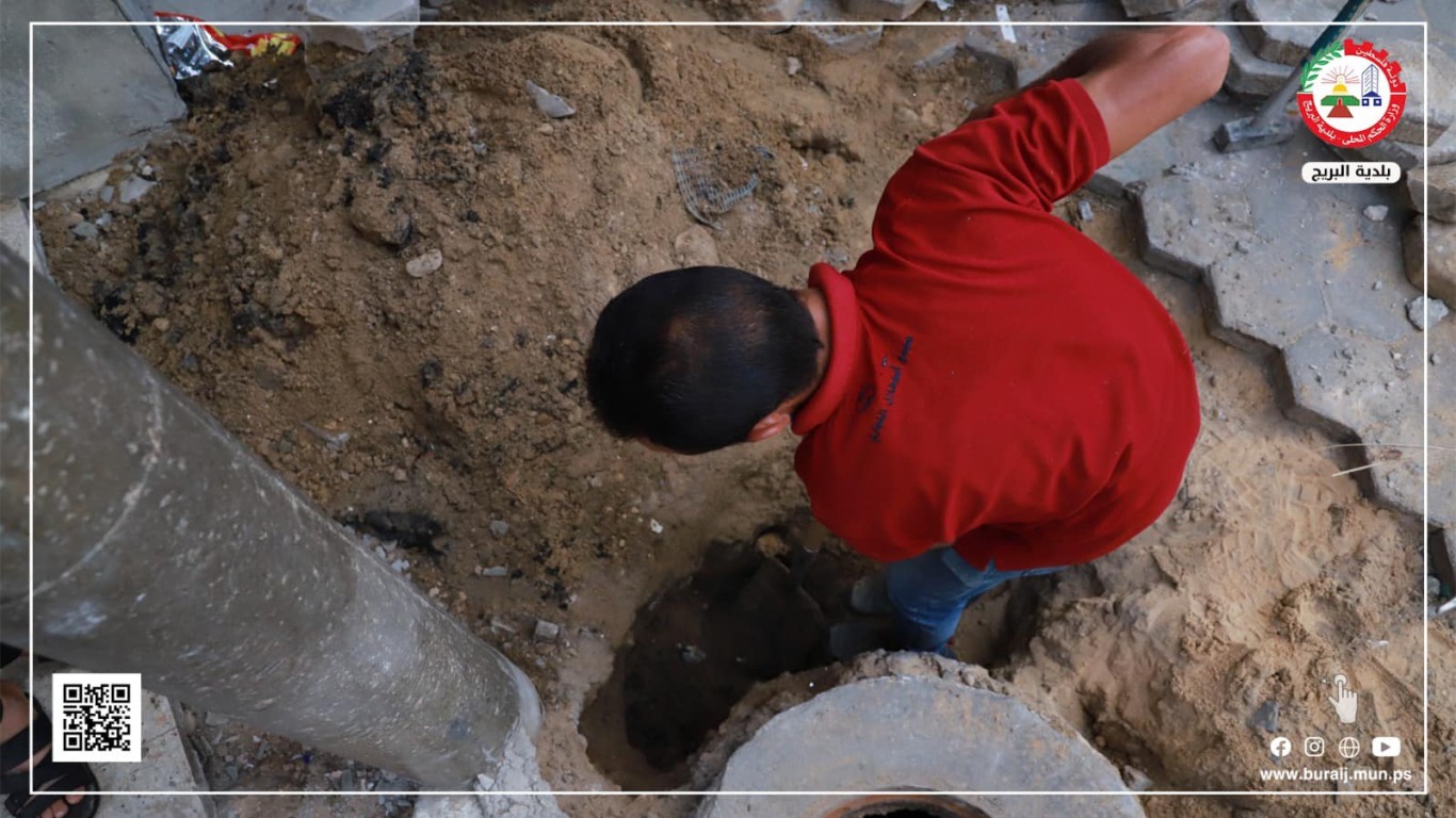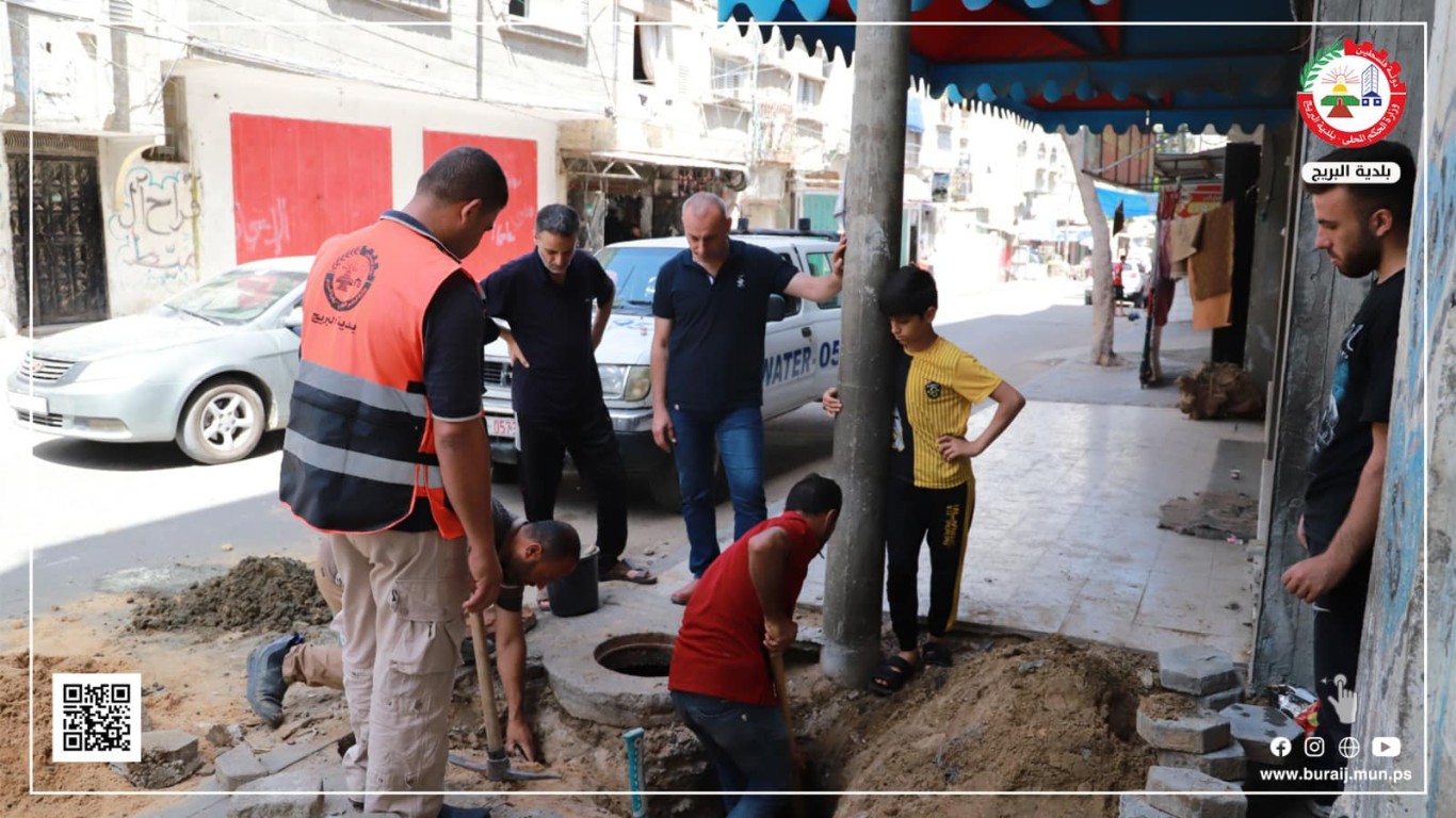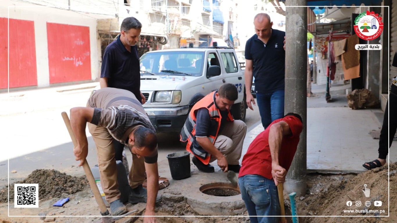 قسم المواصفات والمشاريع خلال أعمال معالجة وتصليح هبوط بلاط بجوار إحدى مناهل الصرف الصحي بمنطقة بلوك 4 في البريج