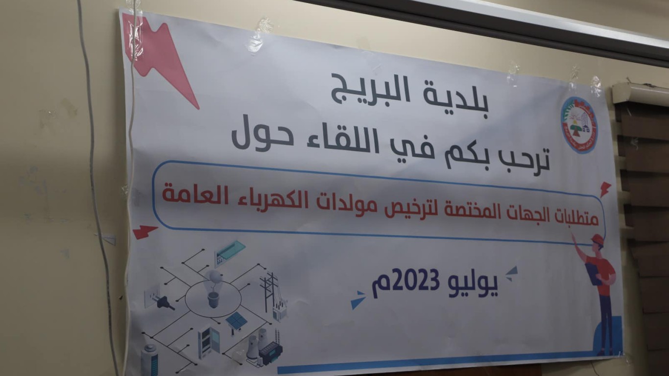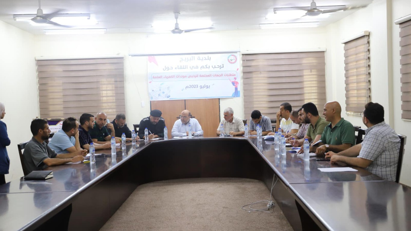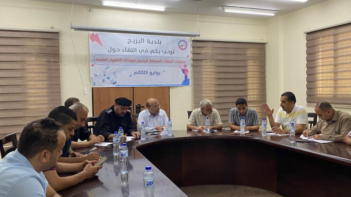 بلدية البريج تعقد لقاء حول "متطلبات الجهات المختصة لترخيص مولدات الكهرباء" لأصحاب مشاريع المولدات الكهربائية في البريج، بهدف تحقيق إجراءات السلامة والمهنية لحماية السكان من المشاريع الخطرة فيها.
