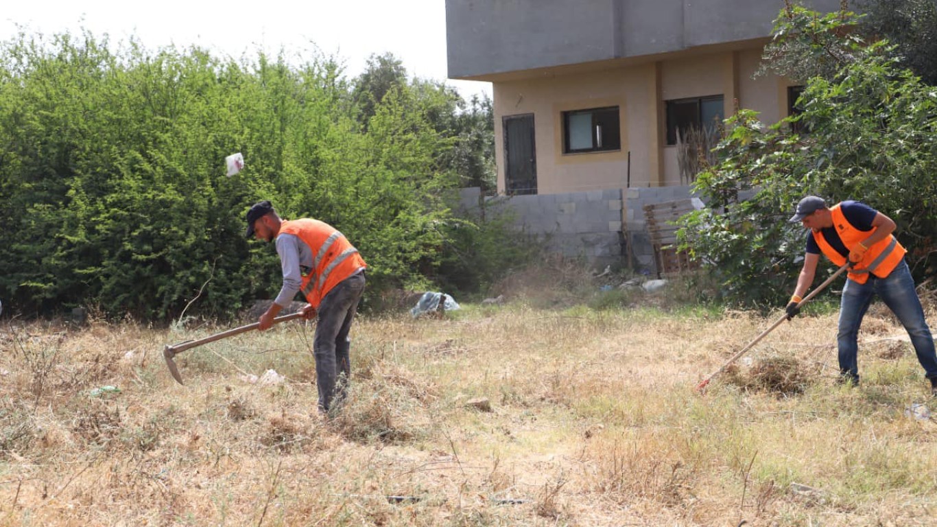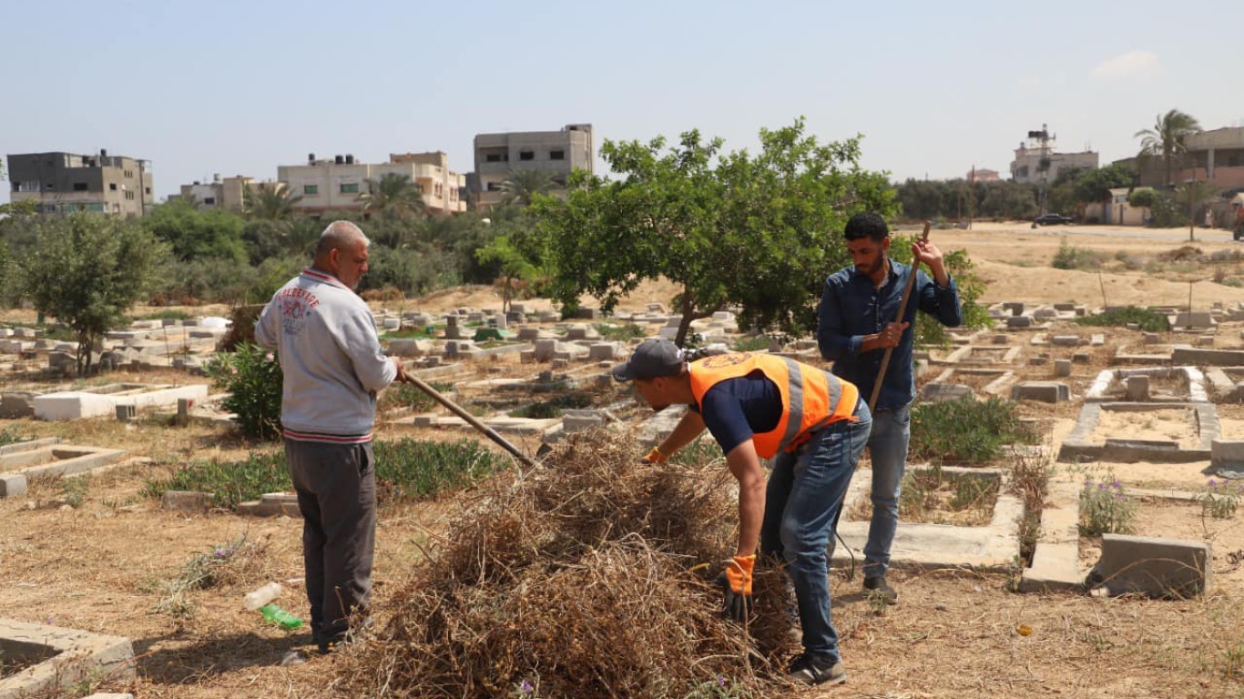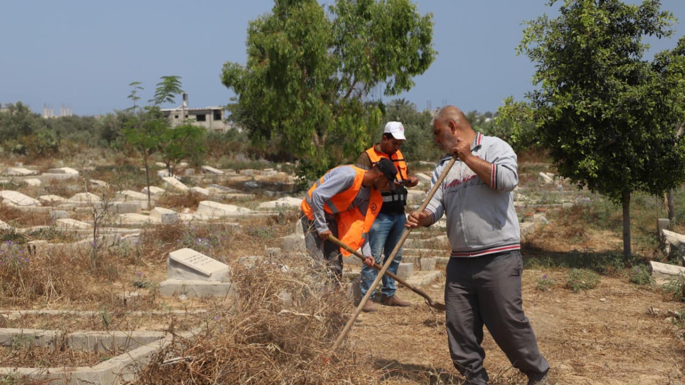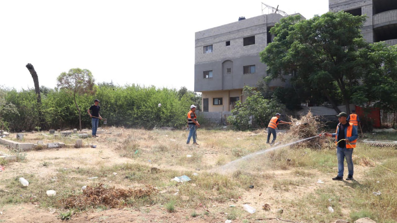 قسم الصحة والبيئة يواصل أعماله ضمن حملة تعشيب وتنظيف ورش مقبرتي بلوك 1 وبلوك 8 .
