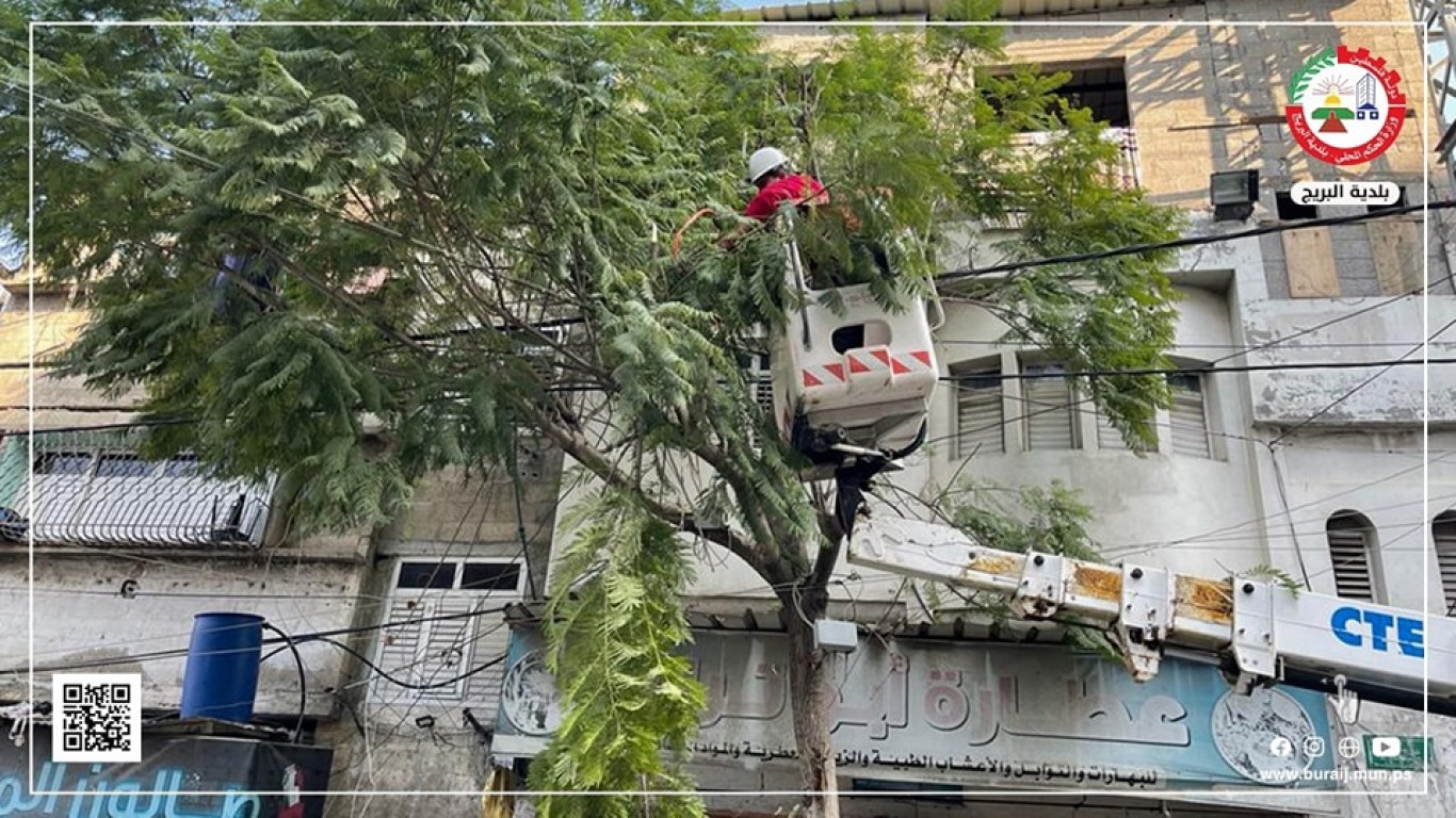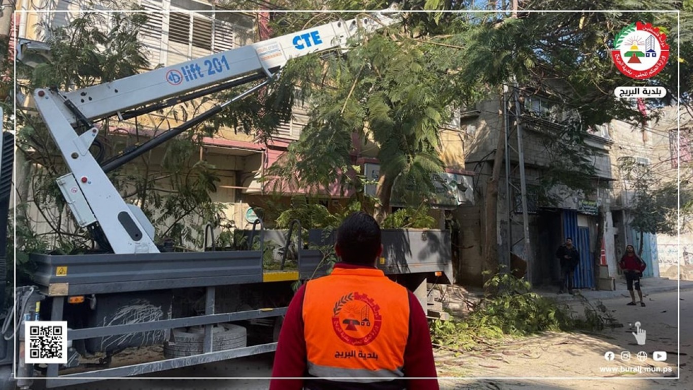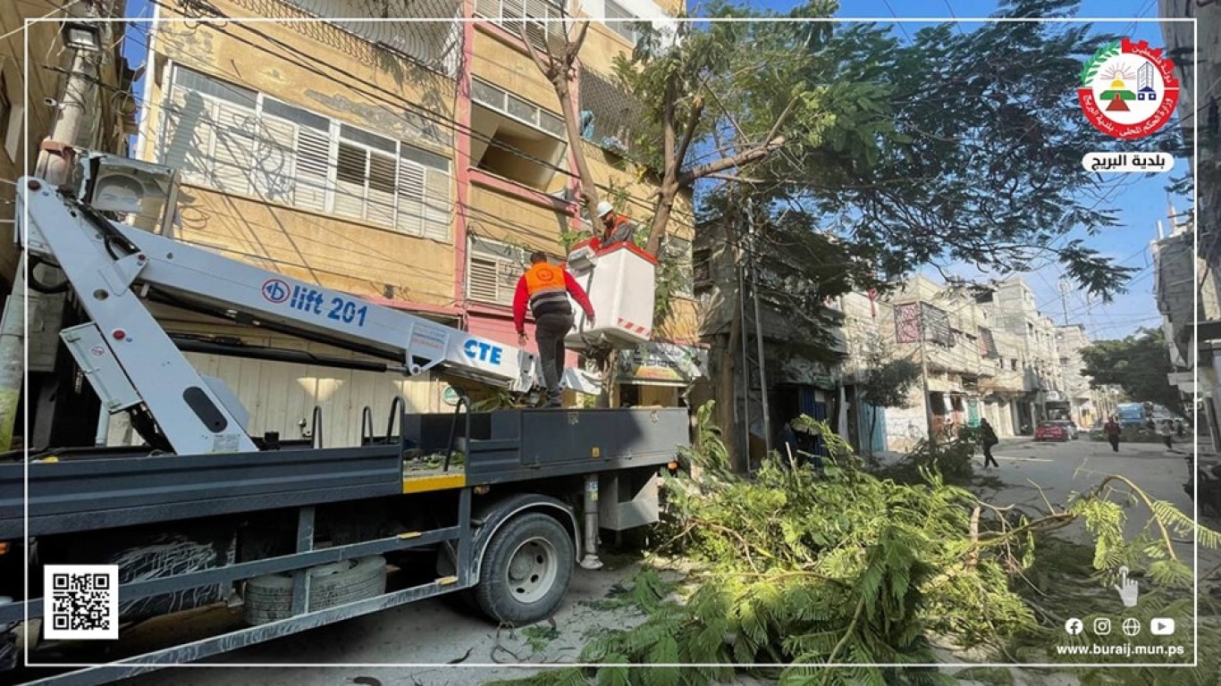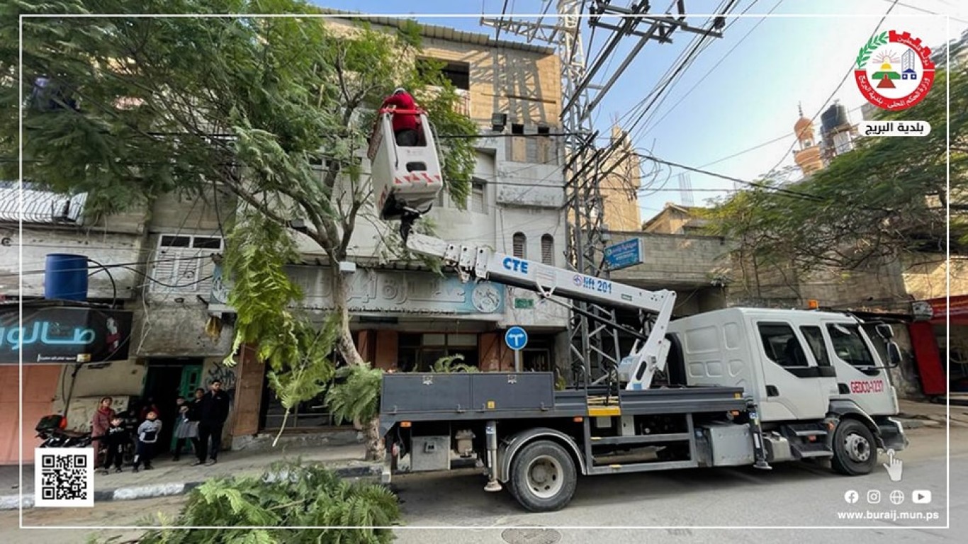 قسم الصحة والبيئة في بلدية البريج وبالتعاون مع شركة الكهرباء بالمحافظة الوسطى، خلال أعمال إزالة الخطر القريب من الضغط المرتفع في منطقة بلوك 7، حفاظاً على سلامة المواطنين.