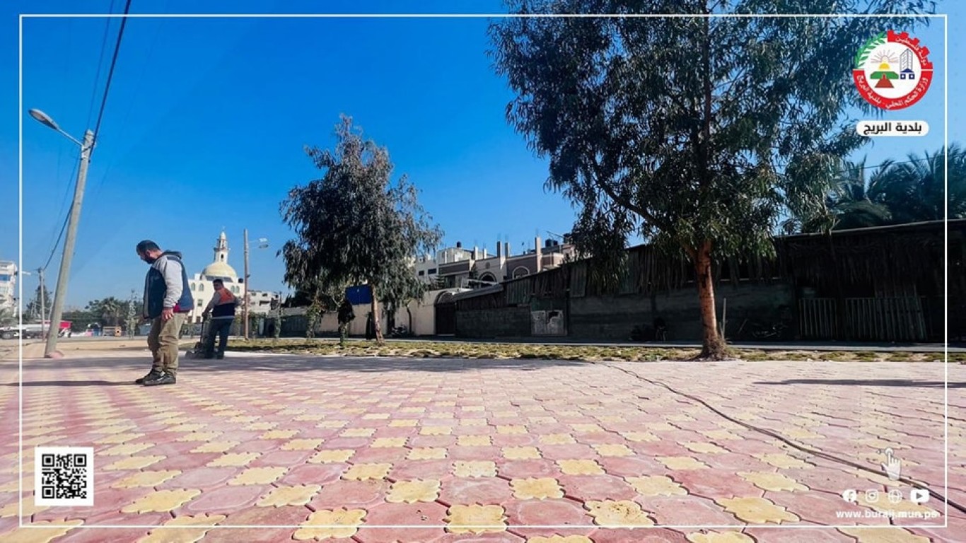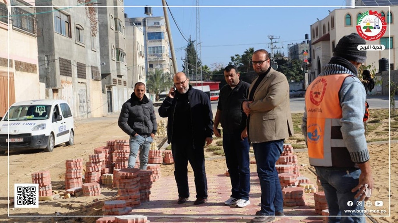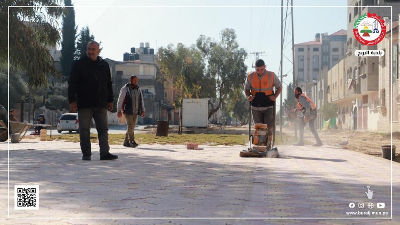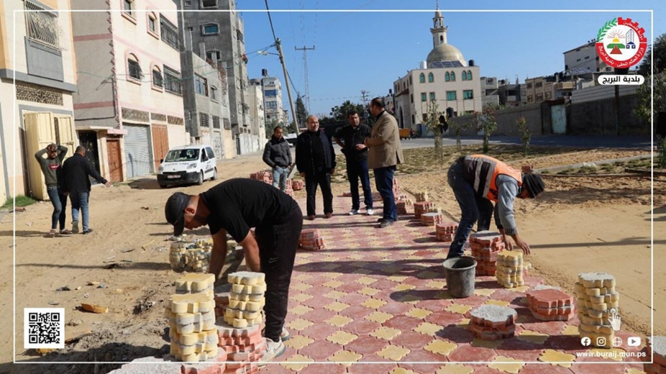 قسم المواصفات والمشاريع في بلدية البريج خلال أعمال تبليط جزء من جزيرة شارع السكة ببلاط (البستنة) المزخرف، ضمن خطة البلدية لتطوير شارع السكة والجزيرة الخاصة به، وإعطاءها الطابع المتنزه والجمالي