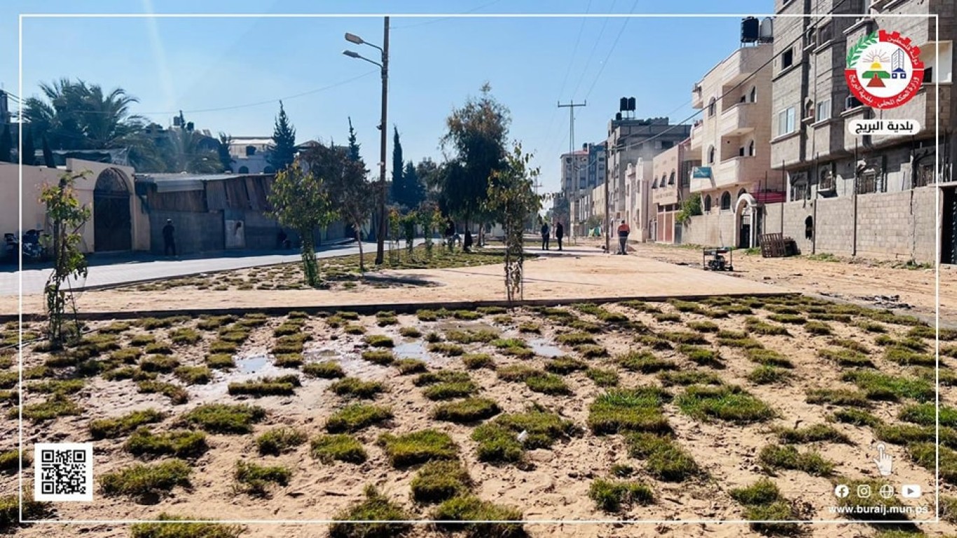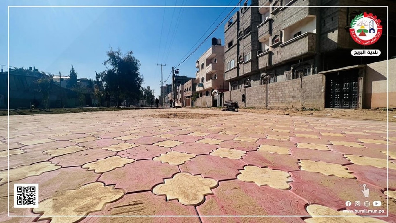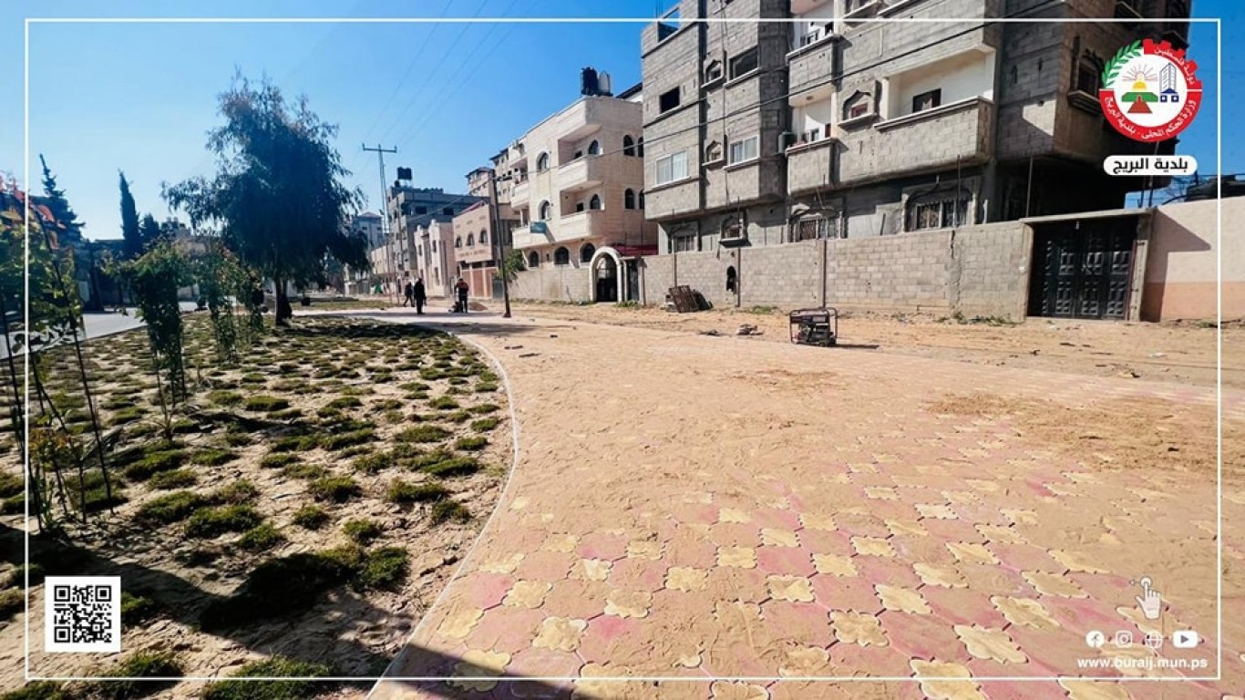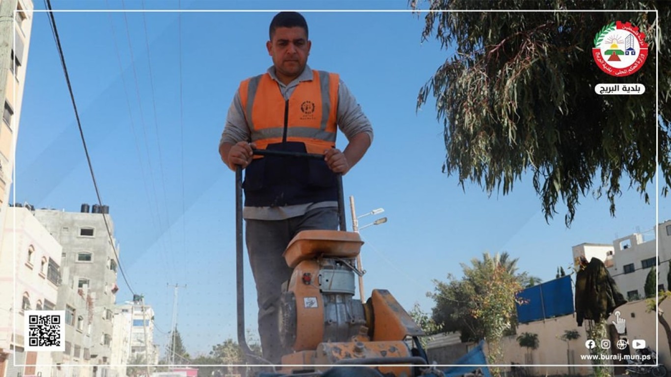 قسم المواصفات والمشاريع في بلدية البريج خلال أعمال تبليط جزء من جزيرة شارع السكة ببلاط (البستنة) المزخرف، ضمن خطة البلدية لتطوير شارع السكة والجزيرة الخاصة به، وإعطاءها الطابع المتنزه والجمالي
